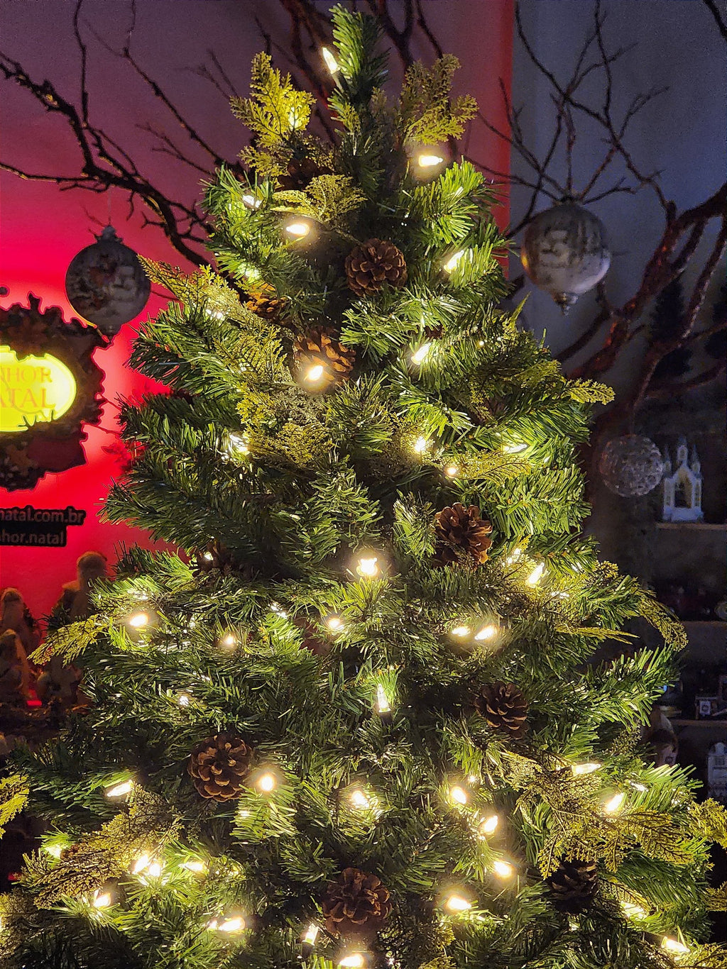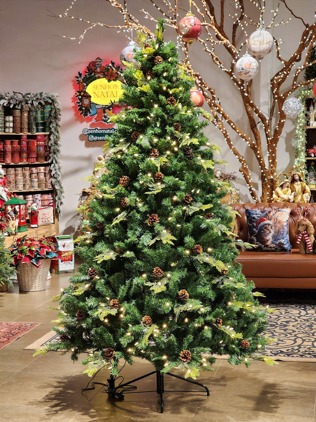 NOVO MODELO DA ÁRVORE CLICK, a árvore com a ligação por plug fácil, no tronco da árvore existe uma conexão de plug para ligação dos piscas, esse sistema e muito utilizado pois a facilidade da montagem e mais rapida, pois os piscas já vem passado nos galhos, esta árvore possui um mix de galhos emborachados e galhos tradicionais, além das pinhas que vem distribuidas sobre os galhos, seu pisca e o tradicional a lampada com bulbo maior em led trazendo mais luminosidade para a árvore.